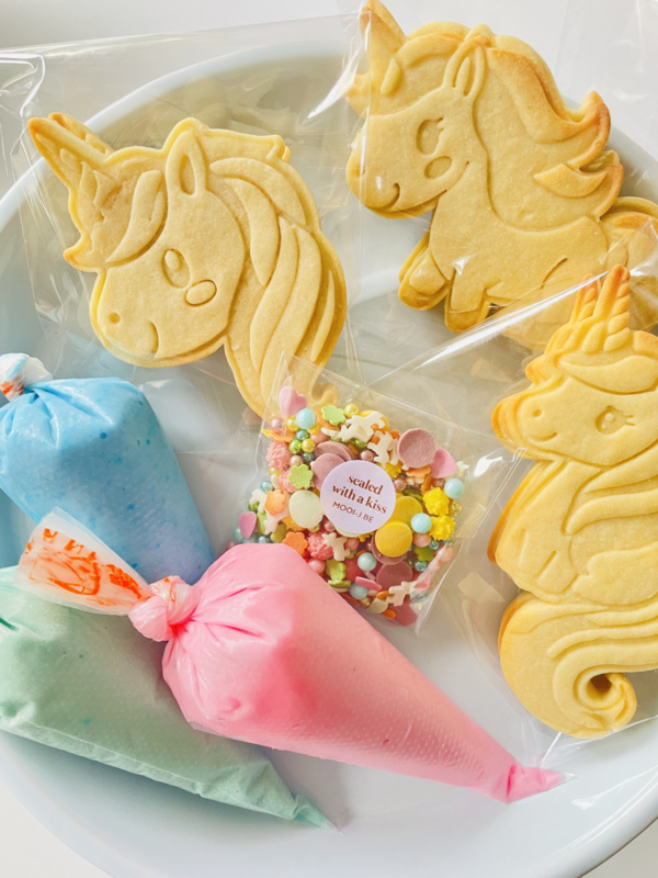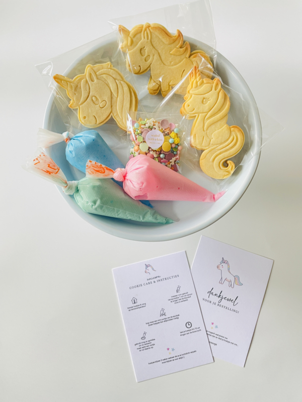 Alles wat je nodig hebt om 6 betoverende unicorn-koekjes te maken zit in één box.